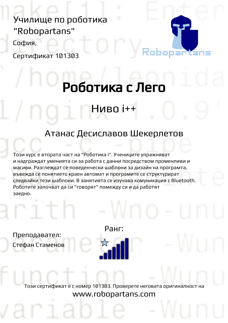 Retiffy certificate 101303 issued to Атанас Десиславов Шекерлетов from template Robopartans with values,city:София,rank:7,name:Атанас Десиславов Шекерлетов,teacher1:Стефан Стаменов