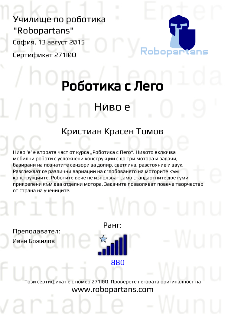 Retiffy certificate 271I0Q issued to Кристиан Красен Томов from template Robopartans with values,city:София,teacher1:Иван Божилов,rank:7,name:Кристиан Красен Томов,date:13 август 2015,points:880