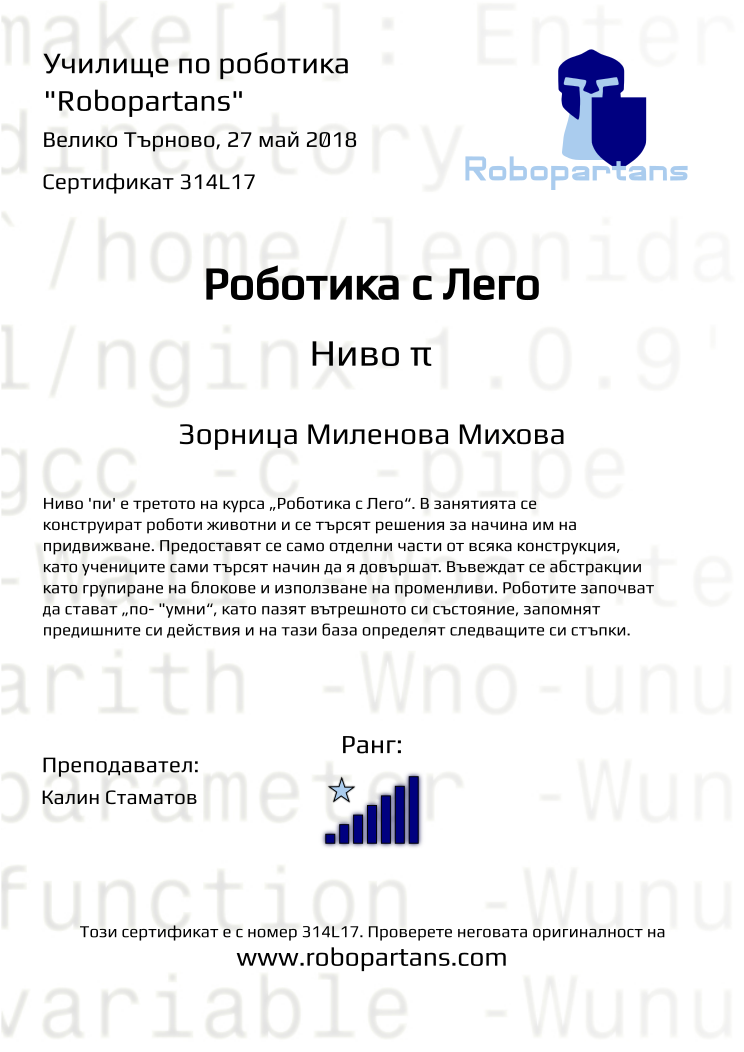 Retiffy certificate 314L17 issued to Зорница Миленова Михова from template Robopartans with values,rank:7,city:Велико Търново,teacher1:Калин Стаматов,name:Зорница Миленова Михова,date:27 май 2018