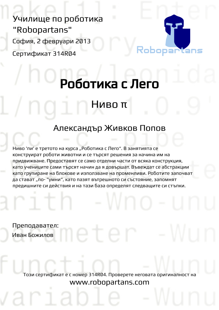 Retiffy certificate 314R04 issued to Александър Живков Попов from template Robopartans with values,city:София,teacher1:Иван Божилов,name:Александър Живков Попов,date:2 февруари 2013