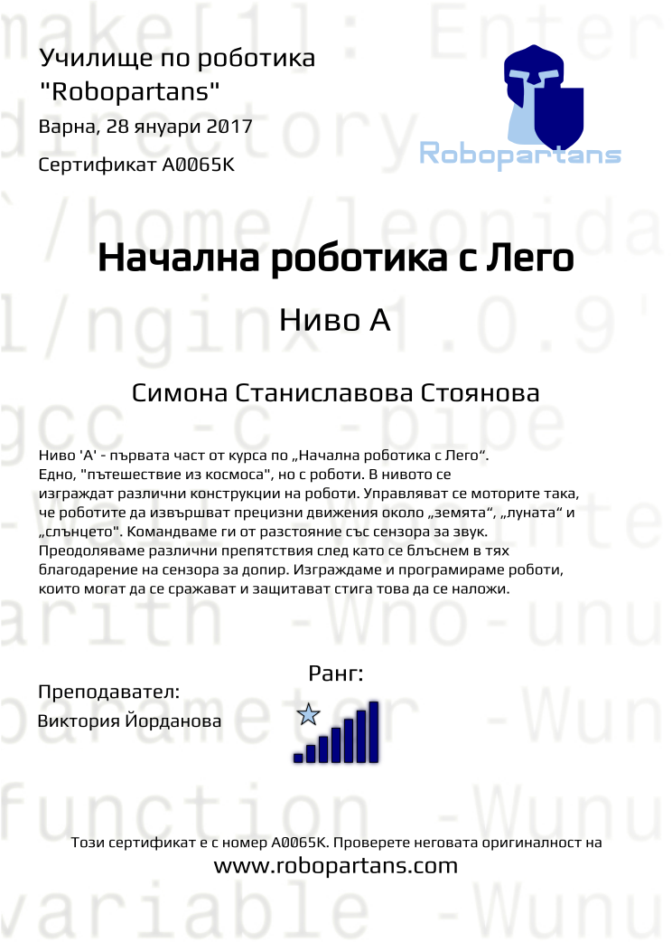 Retiffy certificate A0065K issued to Симона Станиславова Стоянова from template Robopartans with values,city:Варна,rank:7,date:28 януари 2017,name:Симона Станиславова Стоянова,teacher1:Виктория Йорданова