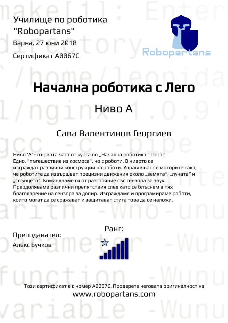 Retiffy certificate A0067C issued to Сава Валентинов Георгиев from template Robopartans with values,city:Варна,rank:7,teacher1:Алекс Бучков,date:27 юни 2018,name:Сава Валентинов Георгиев