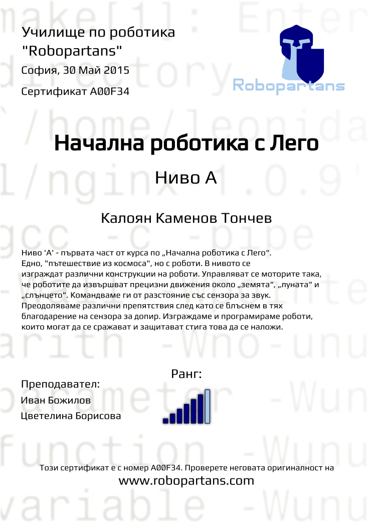 Retiffy certificate A00F34 issued to Калоян Каменов Тончев from template Robopartans with values,city:София,teacher1:Иван Божилов,rank:6,name:Калоян Каменов Тончев,date:30 Май 2015,teacher2:Цветелина Борисова