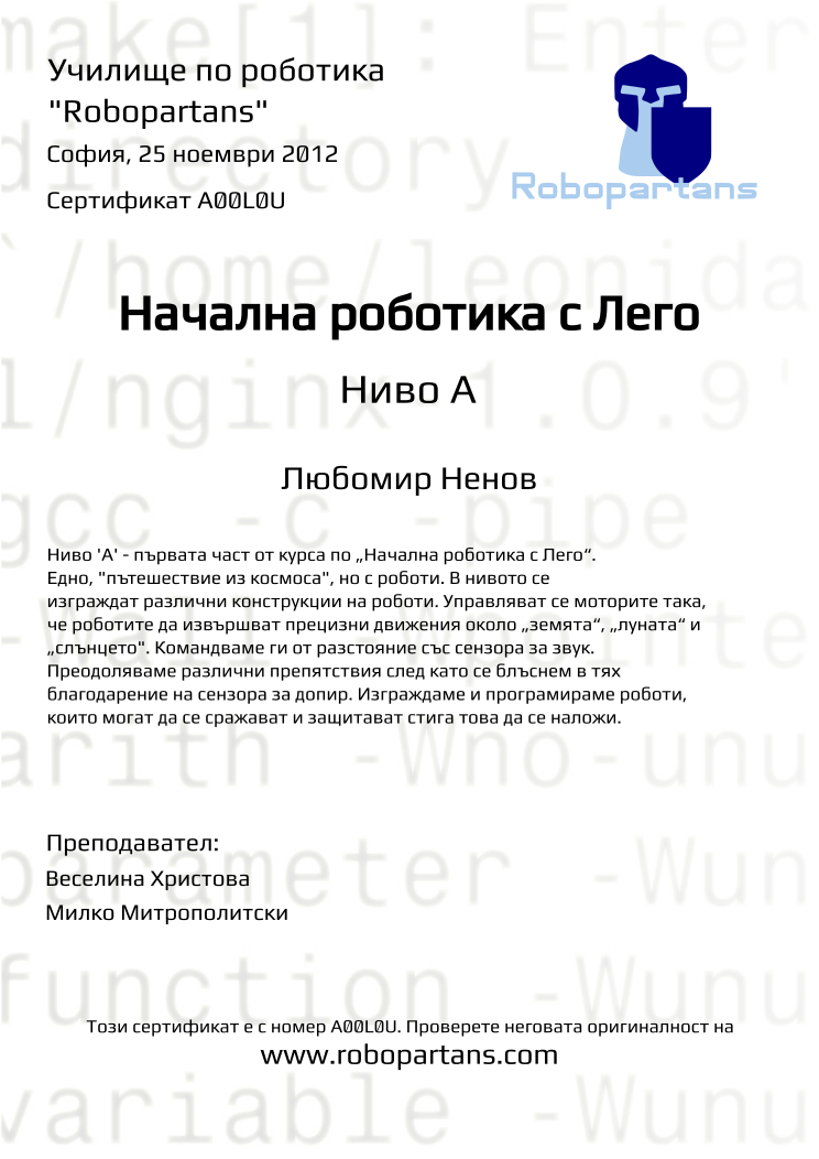 Retiffy certificate A00L0U issued to Любомир Ненов from template Robopartans with values,teacher1:Веселина Христова,city:София,name:Любомир Ненов,date:25 ноември 2012,teacher2:Милко Митрополитски