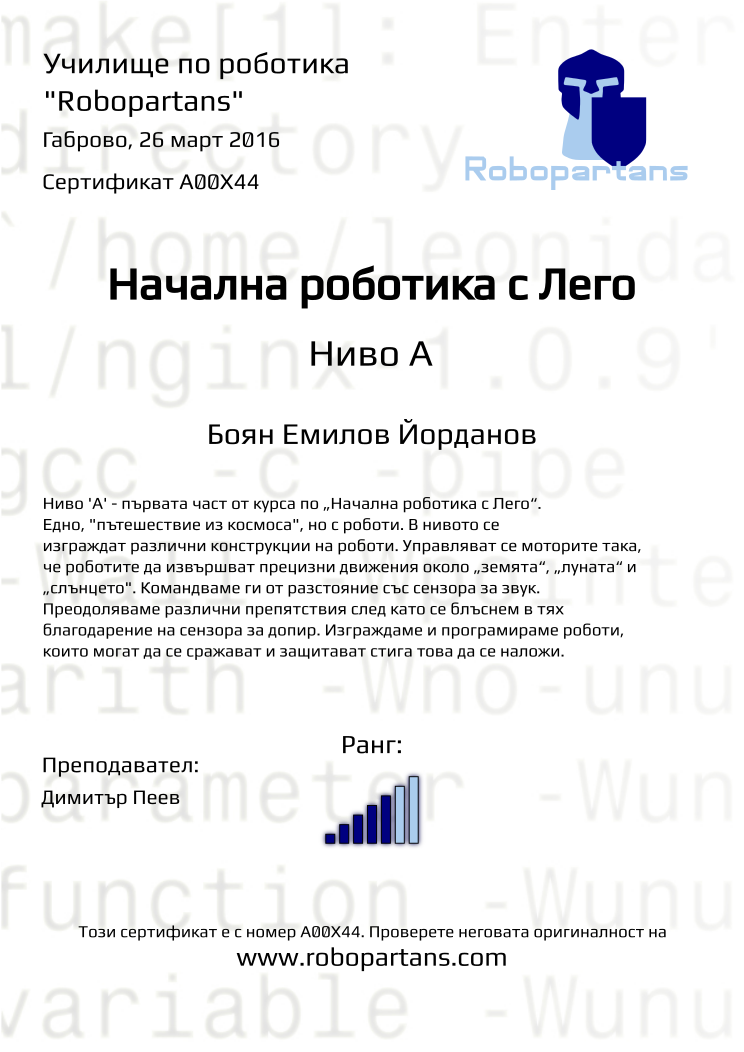 Retiffy certificate A00X44 issued to Боян Емилов Йорданов from template Robopartans with values,rank:5,city:Габрово,name:Боян Емилов Йорданов,date:26 март 2016,teacher1:Димитър Пеев