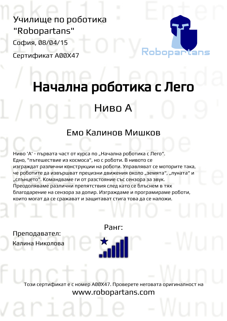 Retiffy certificate A00X47 issued to Емо Калинов Мишков from template Robopartans with values,city:София,rank:8,teacher1:Калина Николова,date:08/04/15,name:Емо Калинов Мишков