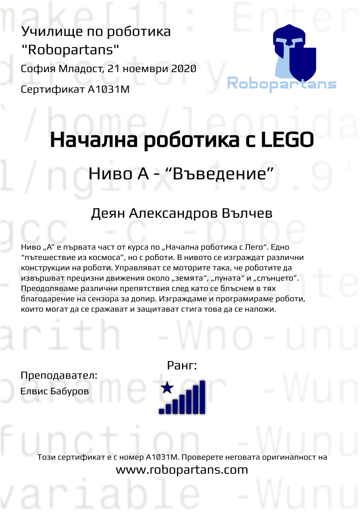 Retiffy certificate A1031M issued to Деян Александров Вълчев from template Robopartans with values,rank:8,teacher1:Елвис Бабуров,city:София Младост,date:21 ноември 2020,name:Деян Александров Вълчев