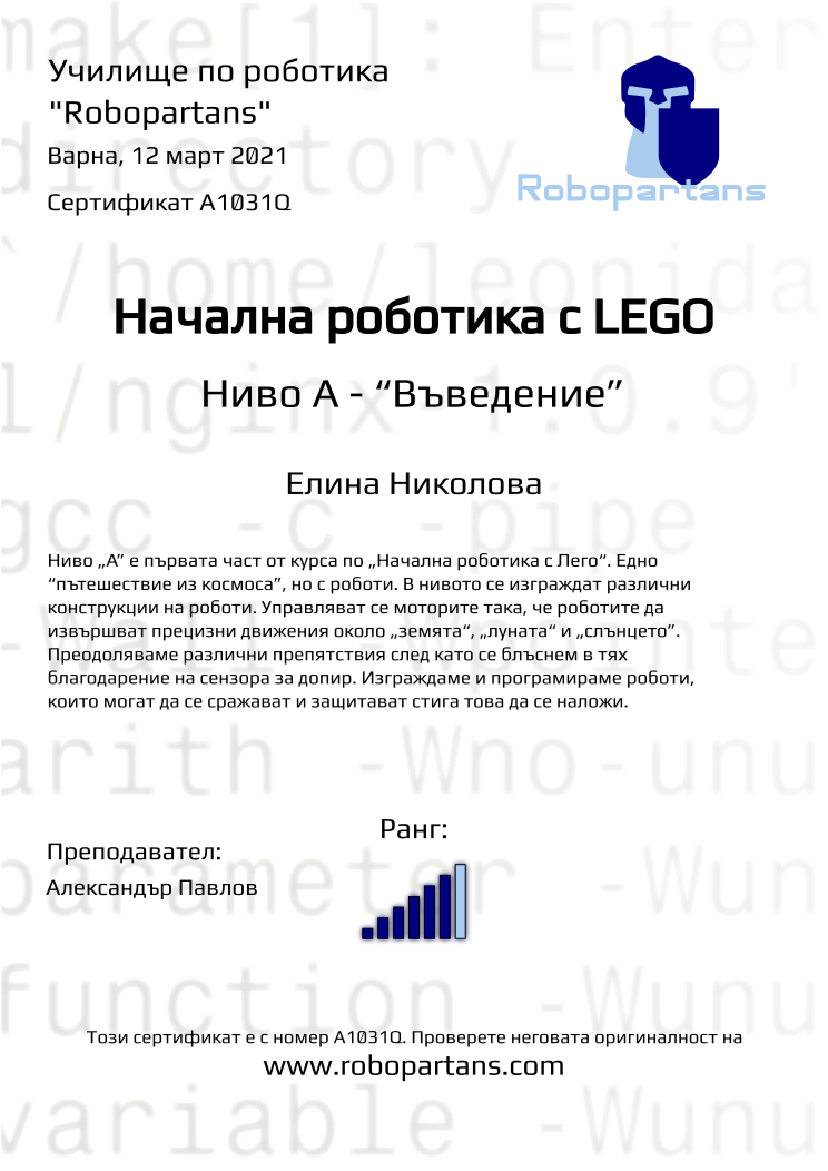 Retiffy certificate A1031Q issued to Елина Николова from template Robopartans with values,city:Варна,teacher1:Александър Павлов,rank:6,name:Елина Николова,date:12 март 2021