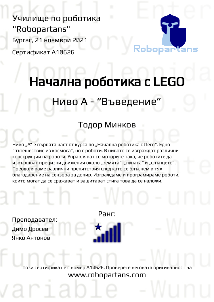 Retiffy certificate A10626 issued to Тодор Минков from template Robopartans with values,city:Бургас,rank:8,date:21 ноември 2021,teacher1:Димо Дросев,teacher2:Янко Антонов,name:Тодор Минков