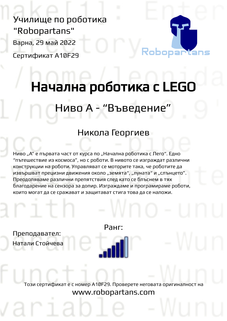 Retiffy certificate A10F29 issued to Никола Георгиев from template Robopartans with values,city:Варна,rank:6,teacher1:Натали Стойчева,date:29 май 2022,name:Никола Георгиев