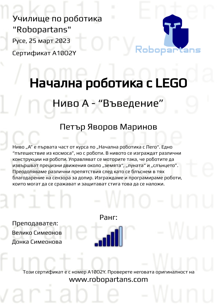 Retiffy certificate A10O2Y issued to Петър Яворов Маринов from template Robopartans with values,rank:6,city:Русе,name:Петър Яворов Маринов,date:25 март 2023,teacher1:Велико Симеонов,teacher2:Донка Симеонова