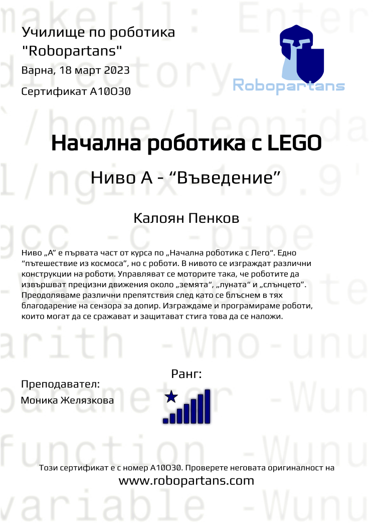 Retiffy certificate A10O30 issued to Калоян Пенков from template Robopartans with values,city:Варна,rank:8,teacher1:Моника Желязкова,name:Калоян Пенков,date:18 март 2023