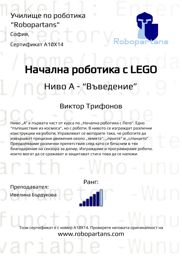 Retiffy certificate A10X14 issued to Виктор Трифонов from template Robopartans with values,city:София,rank:6,teacher1:Ивелина Бърдукова,Date:10 ноември 2019,name:Виктор Трифонов