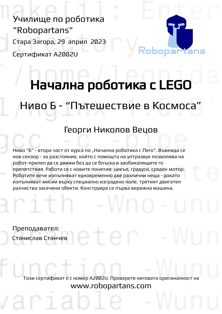 Retiffy certificate A2002U issued to Георги Николов Вецов from template Robopartans with values,city:Стара Загора,teacher1:Станислав Станчев,name:Георги Николов Вецов,date:29  април  2023