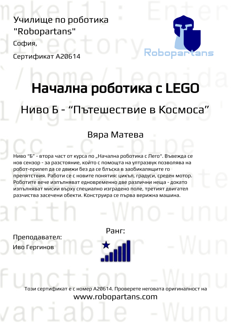 Retiffy certificate A20614 issued to Вяра Матева from template Robopartans with values,city:София,rank:8,teacher1:Иво Гергинов,Date:26 януари 2020,name:Вяра Матева