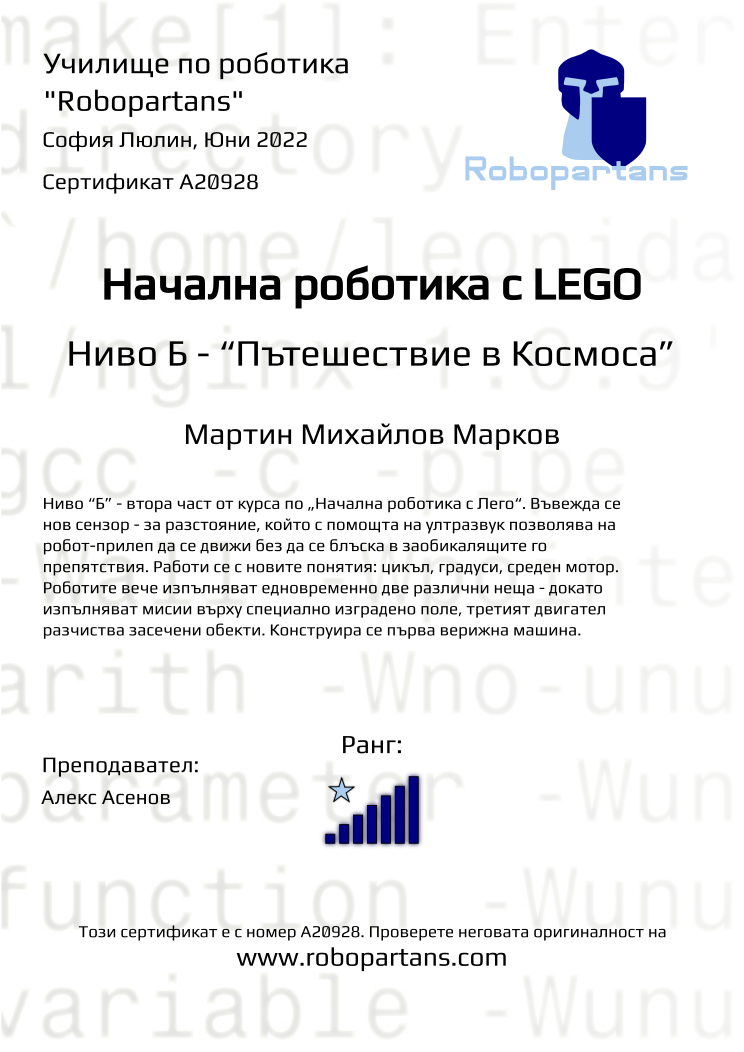 Retiffy certificate A20928 issued to Мартин Михайлов Марков from template Robopartans with values,rank:7,teacher1:Алекс Асенов,city:София Люлин,name:Мартин Михайлов Марков,date:Юни 2022