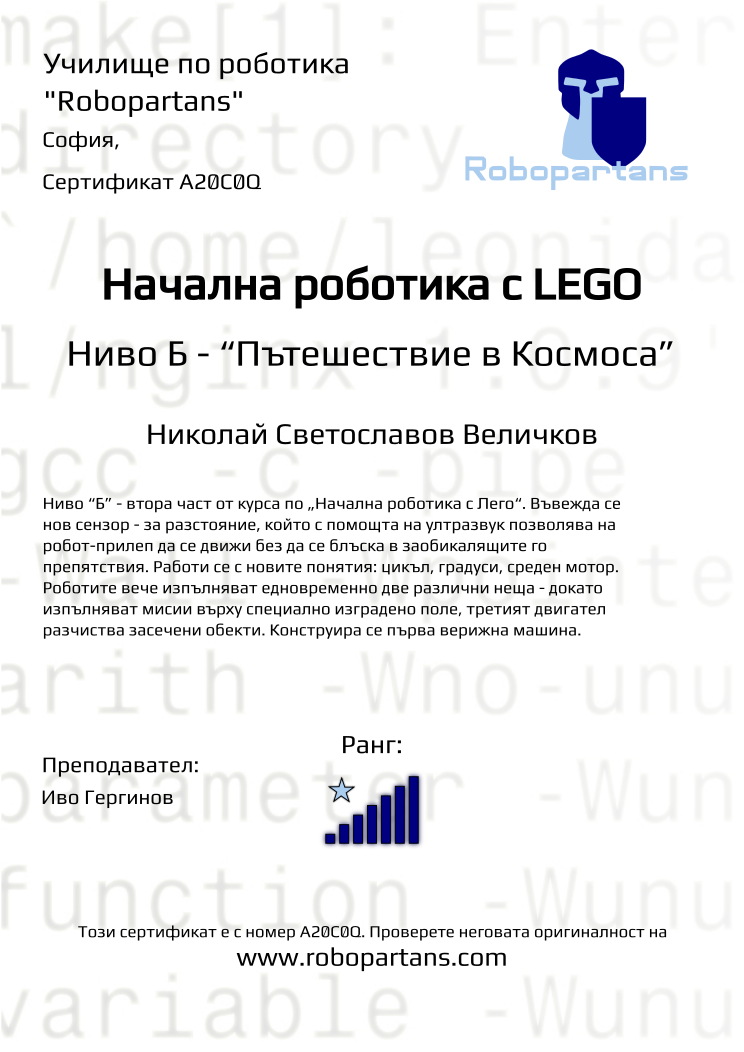 Retiffy certificate A20C0Q issued to Николай Светославов Величков from template Robopartans with values,city:София,rank:7,teacher1:Иво Гергинов,Date:26 януари 2020,name:Николай Светославов Величков