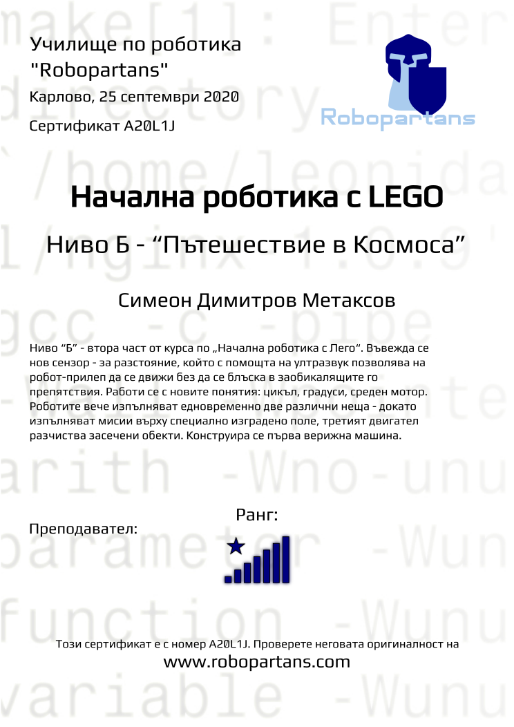 Retiffy certificate A20L1J issued to Симеон Димитров Метаксов from template Robopartans with values,rank:8,city:Карлово,date:25 септември 2020 ,name:Симеон Димитров Метаксов