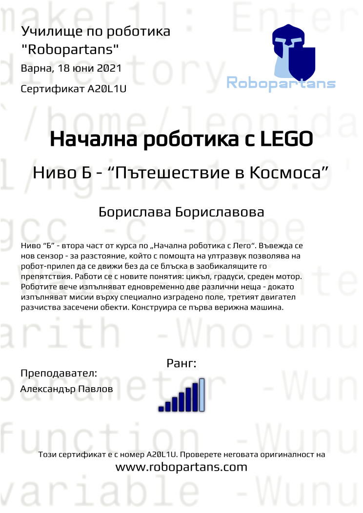 Retiffy certificate A20L1U issued to Борислава Бориславова from template Robopartans with values,city:Варна,teacher1:Александър Павлов,rank:6,name:Борислава Бориславова,date:18 юни 2021