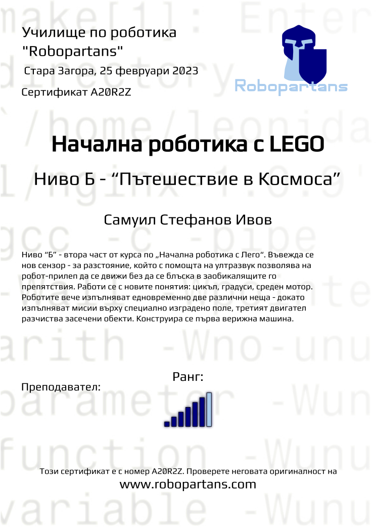 Retiffy certificate A20R2Z issued to Самуил Стефанов Ивов from template Robopartans with values,rank:6,name:Самуил Стефанов Ивов,date:25 февруари 2023,city: Стара Загора