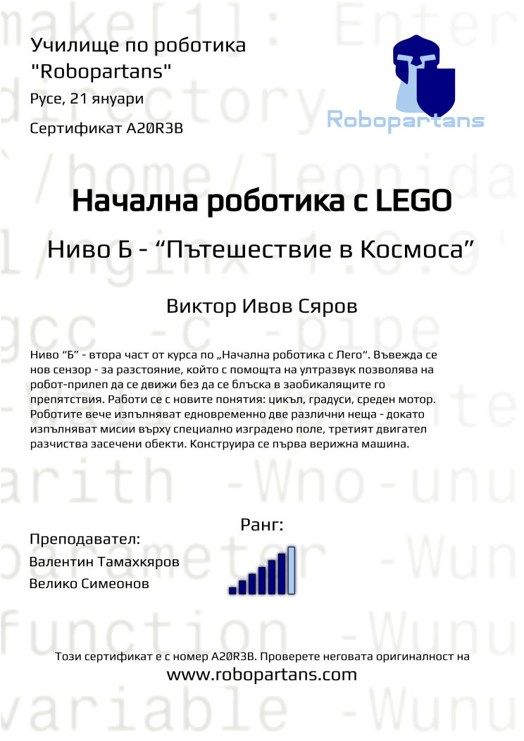 Retiffy certificate A20R3B issued to Виктор Ивов Сяров from template Robopartans with values,rank:6,city:Русе,teacher1:Валентин Тамахкяров,teacher2:Велико Симеонов,name:Виктор Ивов Сяров,date:21 януари