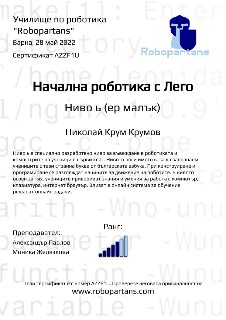 Retiffy certificate AZZF1U issued to Николай Крум Крумов from template Robopartans with values,city:Варна,teacher1:Александър Павлов,rank:5,date:28 май 2022,teacher2:Моника Желязкова,name:Николай Крум Крумов