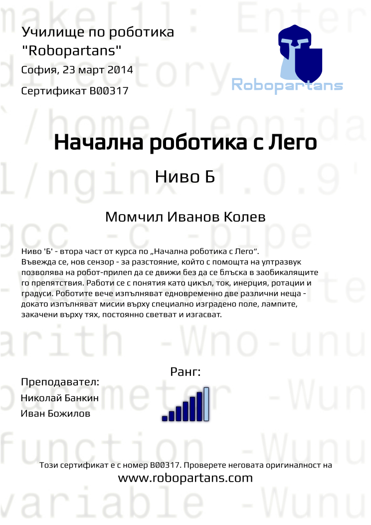 Retiffy certificate B00317 issued to Момчил Иванов Колев from template Robopartans with values,city:София,teacher2:Иван Божилов,rank:6,name:Момчил Иванов Колев,teacher1:Николай Банкин,date:23 март 2014