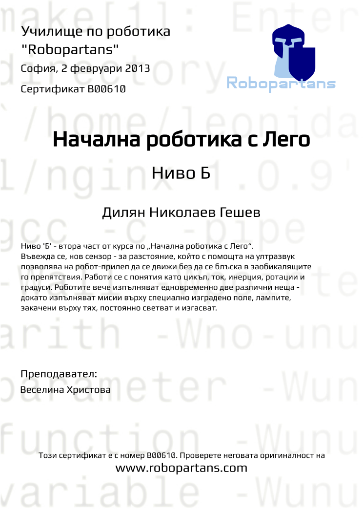 Retiffy certificate B00610 issued to Дилян Николаев Гешев from template Robopartans with values,teacher1:Веселина Христова,city:София,name:Дилян Николаев Гешев,date:2 февруари 2013