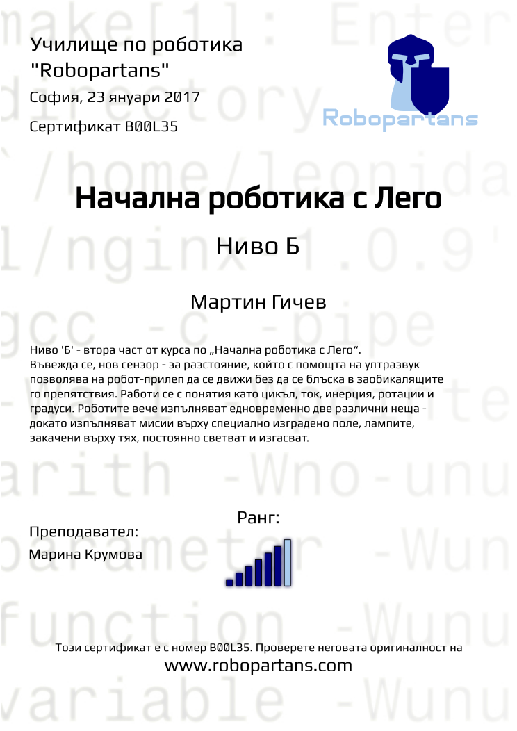 Retiffy certificate B00L35 issued to Мартин Гичев from template Robopartans with values,city:София,rank:6,teacher1:Марина Крумова,name:Мартин Гичев,date:23 януари 2017