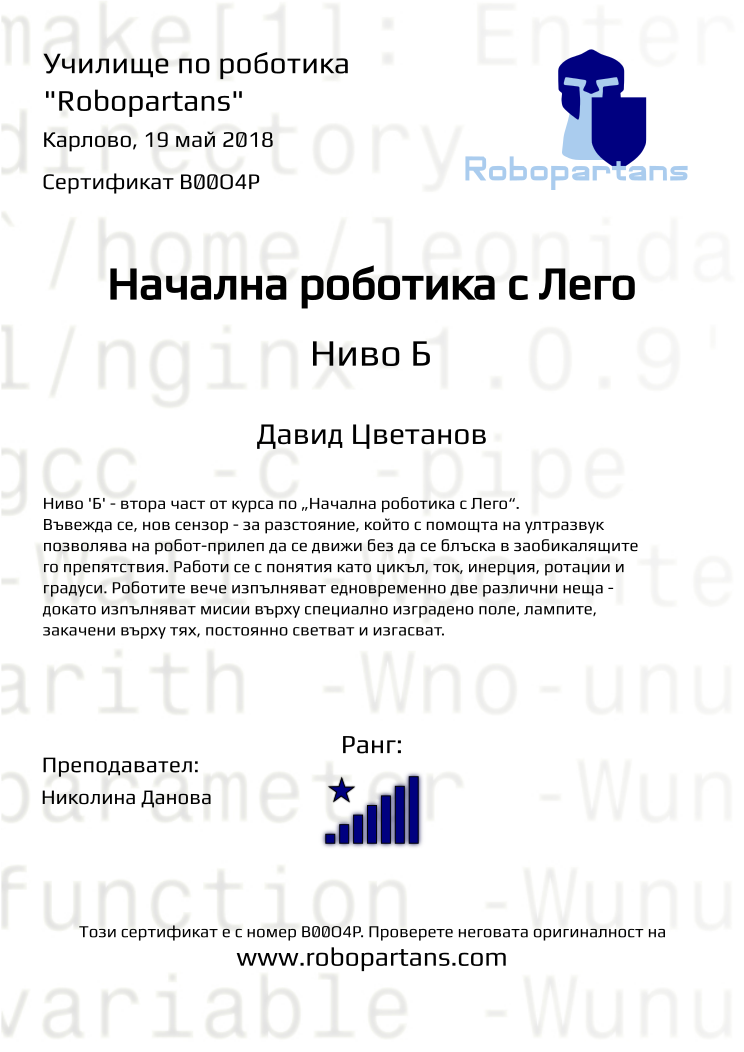 Retiffy certificate B00O4P issued to Давид Цветанов from template Robopartans with values,rank:8,date:19 май 2018,city:Карлово,teacher1:Николина Данова,name:Давид Цветанов