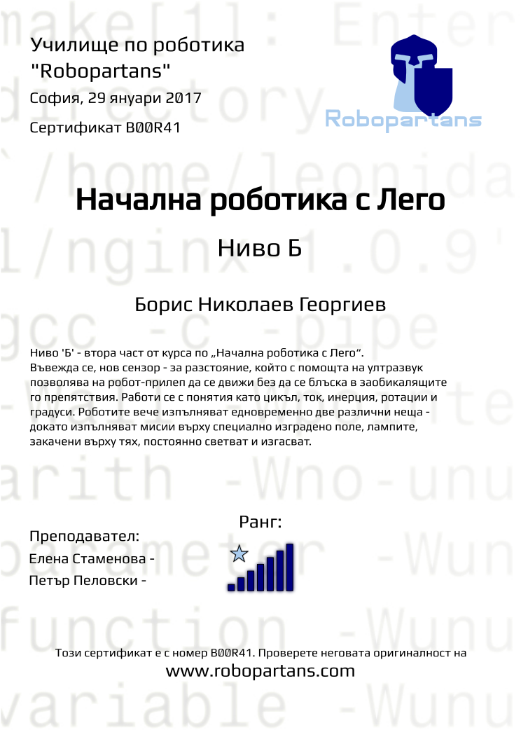 Retiffy certificate B00R41 issued to Борис Николаев Георгиев from template Robopartans with values,city:София,rank:7,date:29 януари 2017,teacher1:Елена Стаменова -,name:Борис Николаев Георгиев,teacher2:Петър Пеловски -
