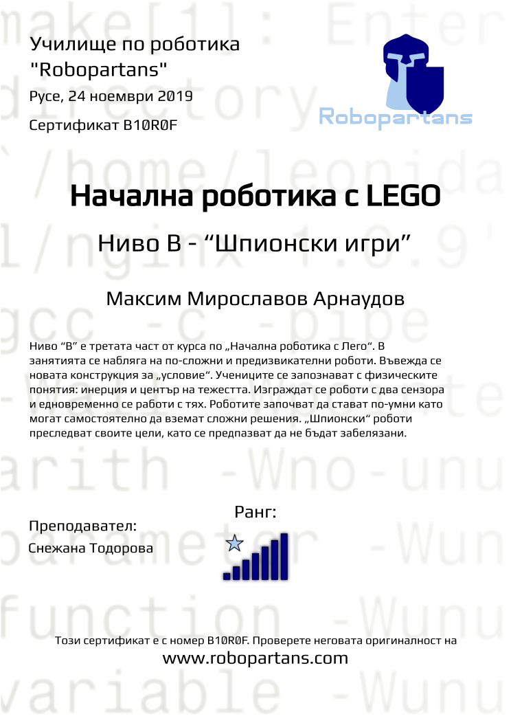 Retiffy certificate B10R0F issued to Максим Мирославов Арнаудов from template Robopartans with values,rank:7,city:Русе,teacher1:Снежана Тодорова,name:Максим Мирославов Арнаудов,date:24 ноември 2019