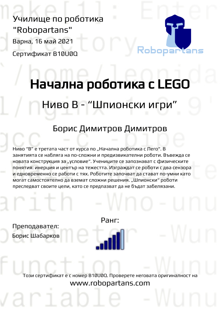 Retiffy certificate B10U0Q issued to Борис Димитров Димитров from template Robopartans with values,city:Варна,rank:6,teacher1:Борис Шабарков,name:Борис Димитров Димитров,date:16 май 2021