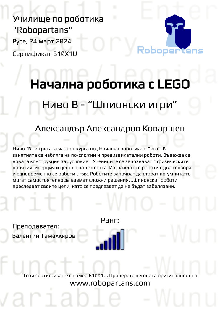 Retiffy certificate B10X1U issued to Александър Александров Коварщен from template Robopartans with values,rank:6,city:Русе,teacher1:Валентин Тамахкяров,name:Александър Александров Коварщен,date:24 март 2024