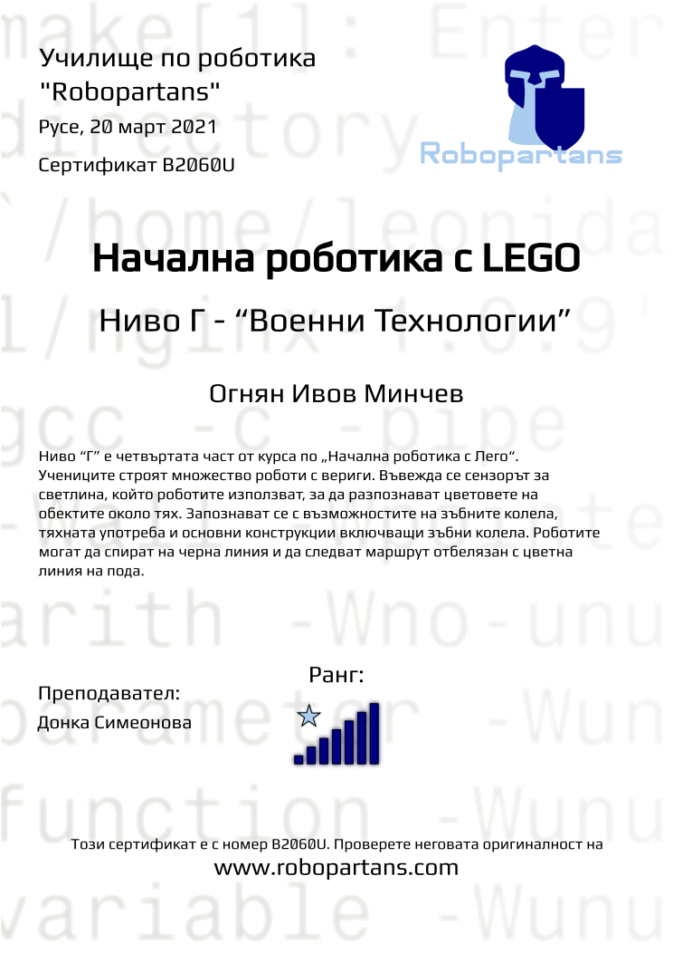 Retiffy certificate B2060U issued to Огнян Ивов Минчев from template Robopartans with values,rank:7,city:Русе,teacher1:Донка Симеонова,name:Огнян Ивов Минчев,date:20 март 2021