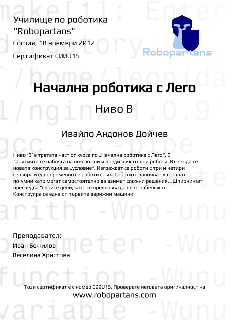 Retiffy certificate C00U15 issued to Ивайло Андонов Дойчев  from template Robopartans with values,city:София,teacher1:Иван Божилов,teacher2:Веселина Христова,name:Ивайло Андонов Дойчев ,date:18 ноември 2012