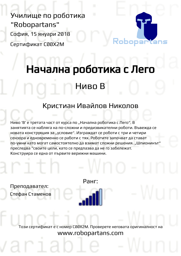 Retiffy certificate C00X2M issued to Кристиан Ивайлов Николов from template Robopartans with values,city:София,rank:6,teacher1:Стефан Стаменов,name:Кристиан Ивайлов Николов,date:15 януари 2018