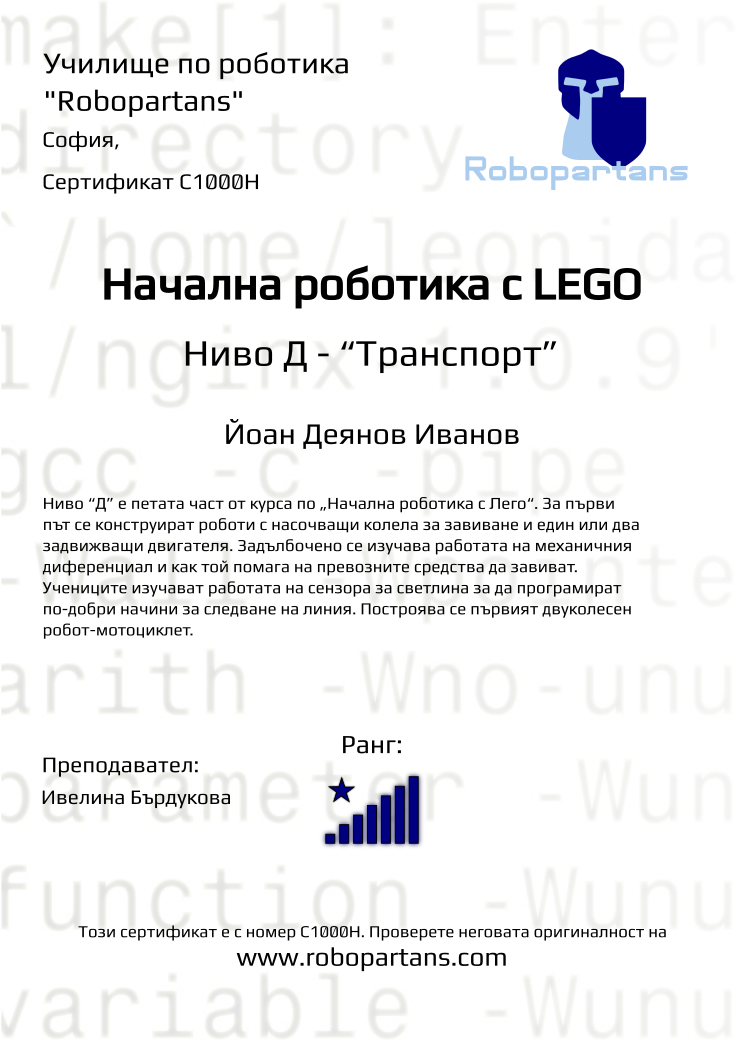Retiffy certificate C1000H issued to Йоан Деянов Иванов from template Robopartans with values,city:София,rank:8,name:Йоан Деянов Иванов,teacher1:Ивелина Бърдукова,Date:9 ноември 2019