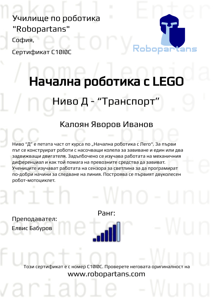 Retiffy certificate C10I0C issued to Калоян Яворов Иванов from template Robopartans with values,city:София,rank:6,name:Калоян Яворов Иванов,teacher1:Елвис Бабуров,Date:26 януари 2020