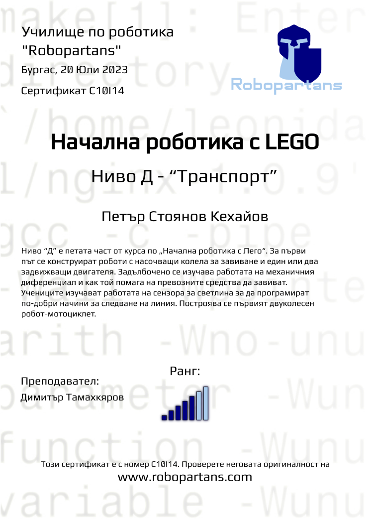 Retiffy certificate C10I14 issued to Петър Стоянов Кехайов from template Robopartans with values,city:Бургас,rank:5,teacher1:Димитър Тамахкяров,name:Петър Стоянов Кехайов,date:20 Юли 2023