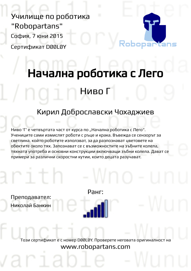 Retiffy certificate D00L0Y issued to Кирил Доброславски Чохаджиев from template Robopartans with values,city:София,rank:6,teacher1:Николай Банкин,name:Кирил Доброславски Чохаджиев,date:7 юни 2015