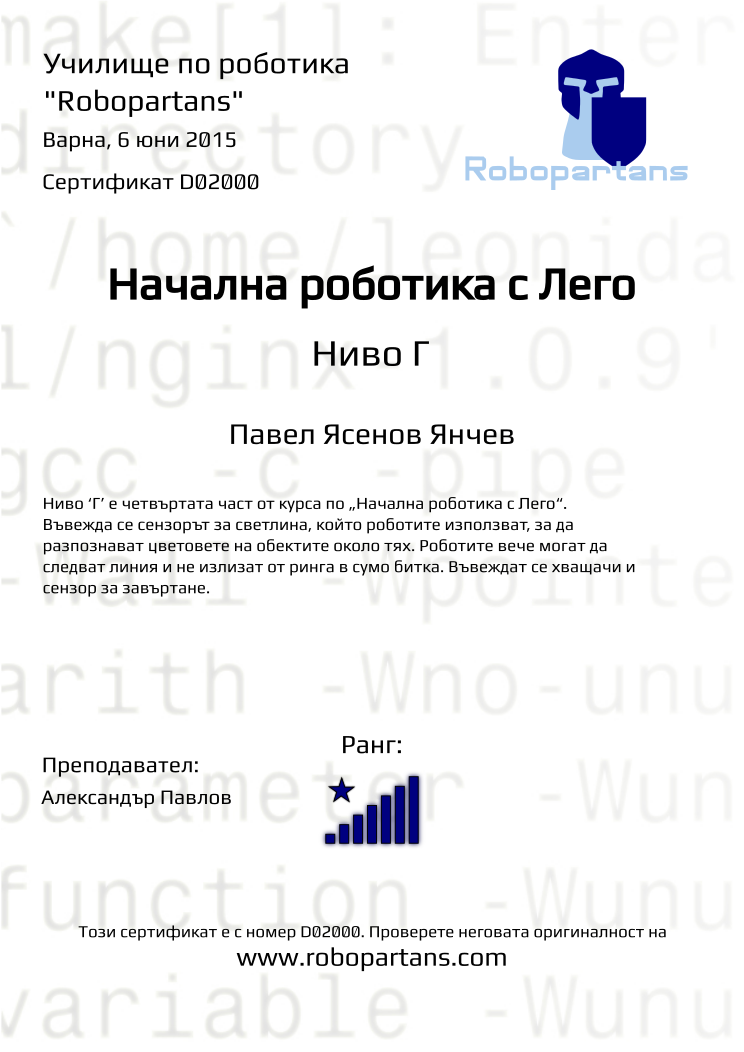 Retiffy certificate D02000 issued to Павел Ясенов Янчев from template Robopartans with values,city:Варна,teacher1:Александър Павлов,rank:8,name:Павел Ясенов Янчев,date:6 юни 2015