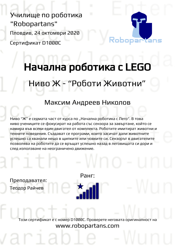 Retiffy certificate D1000C issued to Максим Андреев Николов from template Robopartans with values,rank:8,city:Пловдив,name:Максим Андреев Николов,teacher1:Теодор Райчев,date:24 октомври 2020