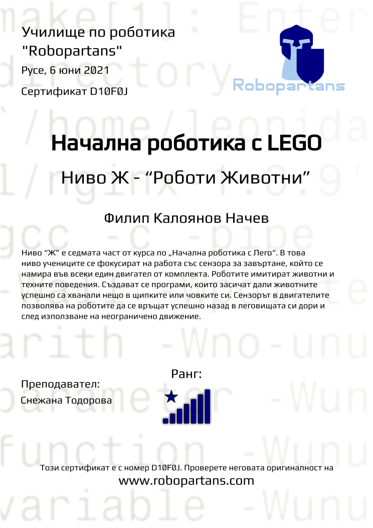 Retiffy certificate D10F0J issued to Филип Калоянов Начев from template Robopartans with values,rank:8,city:Русе,teacher1:Снежана Тодорова,name:Филип Калоянов Начев,date:6 юни 2021