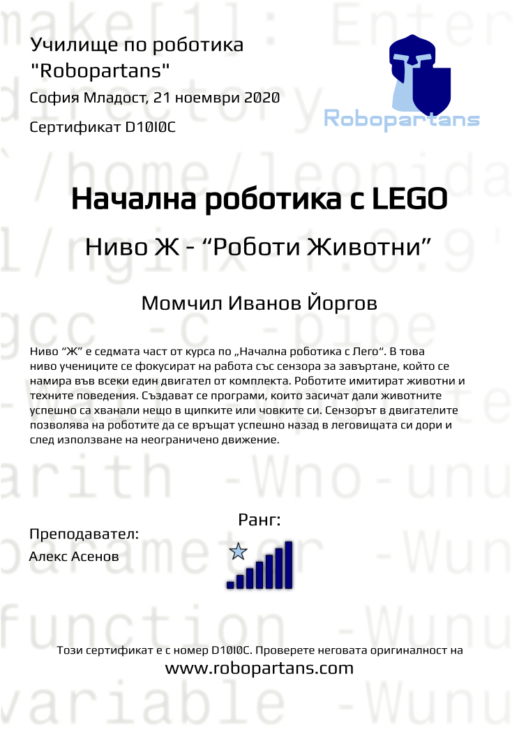 Retiffy certificate D10I0C issued to Момчил Иванов Йоргов  from template Robopartans with values,rank:7,name:Момчил Иванов Йоргов ,city:София Младост,date:21 ноември 2020,teacher1:Алекс Асенов
