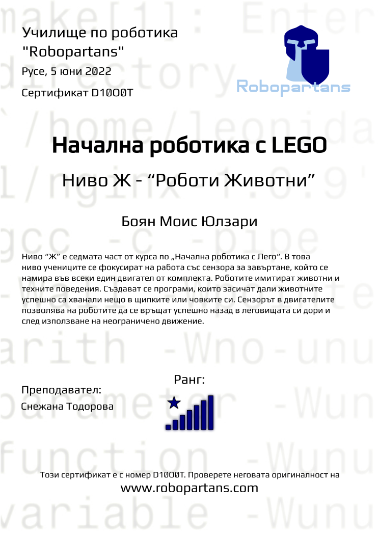 Retiffy certificate D10O0T issued to Боян Моис Юлзари from template Robopartans with values,rank:8,city:Русе,teacher1:Снежана Тодорова,name:Боян Моис Юлзари,date:5 юни 2022