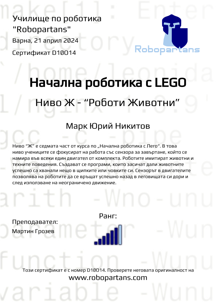 Retiffy certificate D10O14 issued to Марк Юрий Никитов from template Robopartans with values,city:Варна,rank:6,teacher1:Мартин Грозев,name:Марк Юрий Никитов,date:21 април 2024