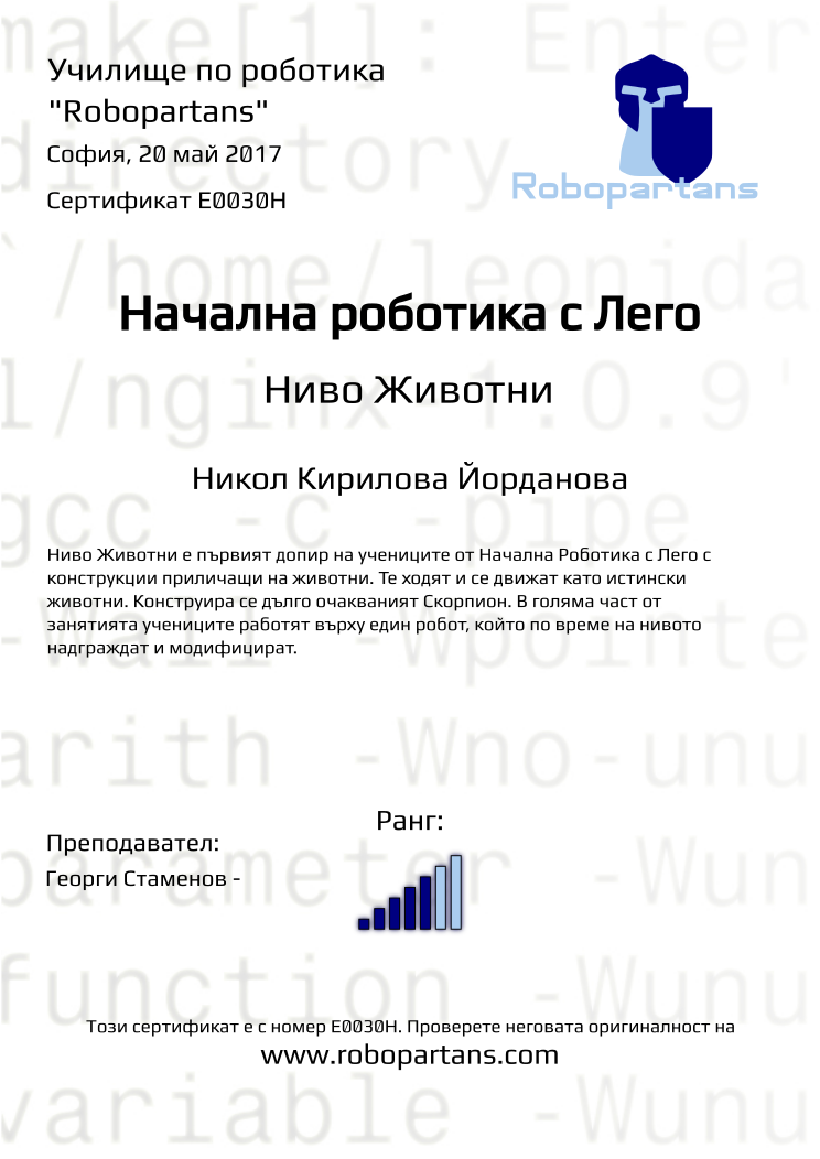Retiffy certificate E0030H issued to Никол Кирилова Йорданова from template Robopartans with values,city:София,rank:5,name:Никол Кирилова Йорданова,teacher1:Георги Стаменов -,date:20 май 2017