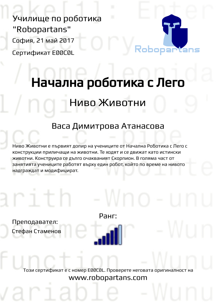 Retiffy certificate E00C0L issued to Васа Димитрова Атанасова from template Robopartans with values,city:София,rank:6,teacher1:Стефан Стаменов,name:Васа Димитрова Атанасова,date:21 май 2017