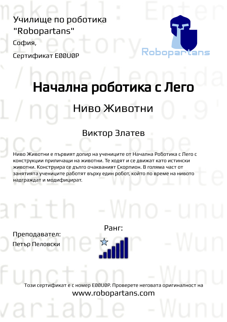 Retiffy certificate E00U0P issued to Виктор Златев from template Robopartans with values,city:София,rank:7,teacher1:Петър Пеловски,name:Виктор Златев
